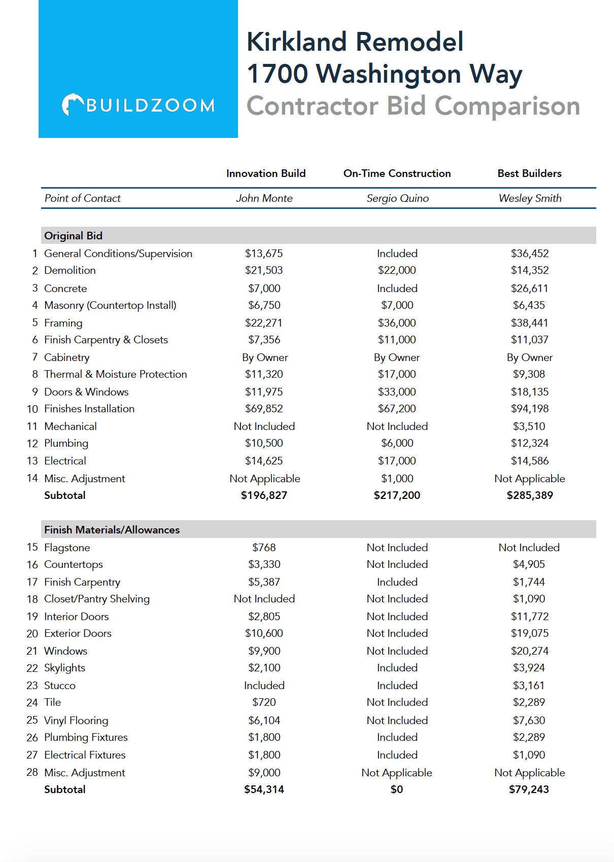 BuildZoom worked with homeowners to reduce scope by $68k and negotiate an additional savings of $28k so that project could be completed within budget.