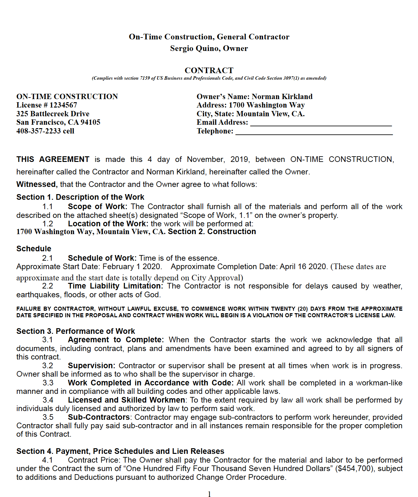 Contract Review. Among other contract changes, BuildZoom negotiated the addition of several clauses to John's contract to hold Pro accountable to completing the project within the agreed-upon timeline.
